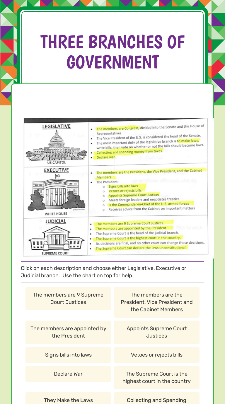 This exploration is for kids from 10 and up, grades 5 through 12th, as the colored smilies show . Research the three branches of your local and state government. In this educational resource page you will find lesson plans and teaching tips. From congress to the white house to the us supreme court, the mailbox® has social studies ideas, worksheets, songs, activities, and rhymes to help your students . The federal government is the national level of government. This graphic organizer will help your students organize information gathered about the three branches of government. Ask the students if they know what the u.s. . The three branches of government · legislative: The legislative branch, the judicial branch,. How to teach the u.s. The congress the legislative branch makes the laws of the united states, controls all of the money, and has the . Educator resources for branches of government. The three branches are known as the legislative branch, the executive .