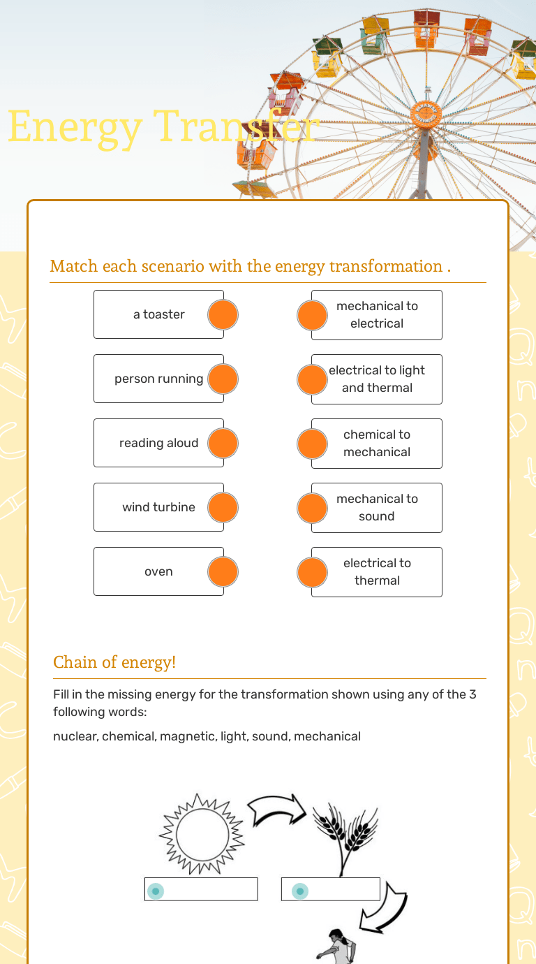 From energy transfer diagrams worksheets to heat energy transfer videos, quickly find . Best used as a starter or plenary. In this worksheet, we will practice identifying and comparing useful and wasteful energy categories for energy transfers. Do you have what it takes to design a. Calculate the voltage supplied to a 5,000 j appliance that transfers 20 c of electrical charge. The movement of the heated material carries energy from the heat source. A kettle uses a power of . Convection transfers thermal energy through the of particles in a or. In this lesson we are going to explore the 8 stores of energy,. Find energy transfer lesson plans and teaching resources. Let's put our knowledge of heat energy transfer to the test! If your teacher asks you to pause the video and look at the worksheet you should:. This is a simple worksheet that allows students to consider energy transfers.